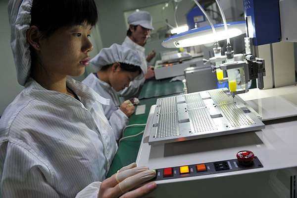 員工在位于廣東佛山南海的廣東昭信光電科技有限公司車間工作(攝于12月1日)。