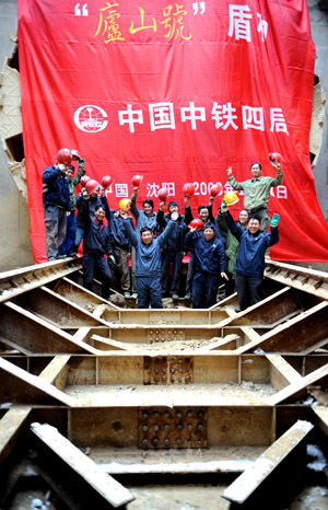 12月8日,參加沈陽地鐵二號線工程建設(shè)的中國中鐵四局職工在“廬山號”盾構(gòu)機(jī)前歡呼。