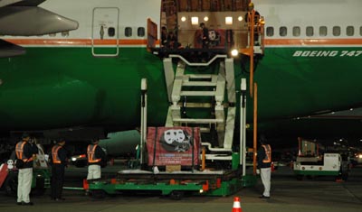 12月23日下午5時許,臺灣長榮航空公司載運贈臺大熊貓“團團”“圓圓”的專機抵達臺北桃園機場。這是專機降落后,工作人員轉(zhuǎn)運“團團”“圓圓”。