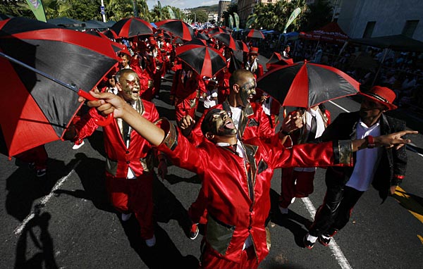 3日,在南非開普敦舉行的一年一度的說唱歌手嘉年華(minstrel festival)上,人們載歌載舞參加慶祝活動。新華社/路透
