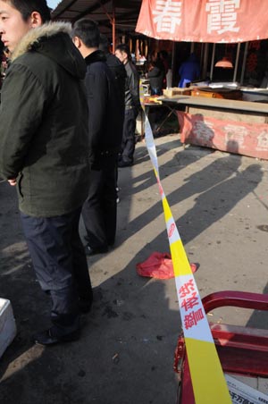 1月7日,河北三河市燕郊行宮活禽市場活禽交易區(qū)域已全部關(guān)閉,市場保安人員在現(xiàn)場警戒線前守護(hù)。 當(dāng)日,河北省三河市關(guān)閉燕郊地區(qū)所有活禽交易市場,并對(duì)外部環(huán)境進(jìn)行采樣和徹底消毒。1月6日,北京市發(fā)生一例人感染高致病性禽流感死亡病例。據(jù)悉,死者生前曾接觸過從河北省三河市燕郊行宮市場購買的活殺鴨肉。目前,三河市尚未發(fā)現(xiàn)禽流感疫情,疫情搜索和各項(xiàng)防控工作正在進(jìn)行中。