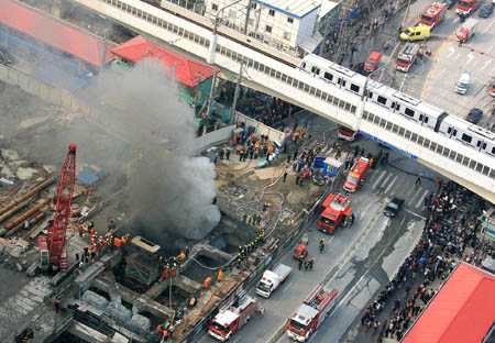 1月8日,一列地鐵列車正從火災(zāi)現(xiàn)場附近駛過。 當(dāng)日11時(shí)30分左右,上海軌道交通11號線曹楊路工地位于地下20余米處發(fā)生火災(zāi),現(xiàn)場濃煙滾滾。到中午12時(shí)30分許,消防部門已經(jīng)從地下救出3名工人,并基本控制火勢。目前已發(fā)現(xiàn)1人死亡。經(jīng)初步確認(rèn),火災(zāi)是由乙炔爆燃引起的。目前,安監(jiān)、消防等部門正在調(diào)查這起事故的具體原因。