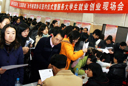 經(jīng)濟(jì)不景氣,就業(yè)成為亟待解決的一大難題。據(jù)有關(guān)部門測(cè)算,2008年我國有100萬大學(xué)畢業(yè)生不能就業(yè),2009年將有592萬大學(xué)生畢業(yè),大學(xué)生就業(yè)壓力有增無減。面對(duì)嚴(yán)峻的就業(yè)形勢(shì),1月7日召開的國務(wù)院常務(wù)會(huì)議明確指出要將大學(xué)生就業(yè)擺在工作首位。記者日前進(jìn)行了多方面的采訪,探討就業(yè)難點(diǎn)所在,尋找破解就業(yè)難的思路。