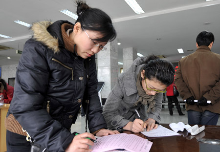 濟(jì)南公益招聘會(huì)溫暖大學(xué)生求職者。去年12月20日,兩位大學(xué)生求職者在填寫信息資料。新華社記者:朱崢