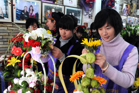 大學(xué)生自主創(chuàng)業(yè)學(xué)花藝。面臨大學(xué)生就業(yè)難的局面,許多應(yīng)屆大學(xué)畢業(yè)生做好自主創(chuàng)業(yè)的準(zhǔn)備,僅在山東輕工學(xué)院就有近十位女生準(zhǔn)備自己開花店,為此她們特意到花藝職業(yè)培訓(xùn)學(xué)校參加花藝培訓(xùn)。新華社記者:范長國