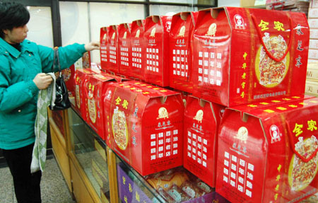 1月7日,一名顧客在選購蘇州百年老店采芝齋推出的賀歲禮盒。