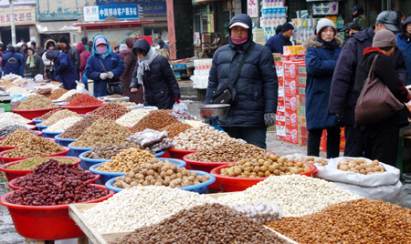 1月15日,市民在選購年貨。當日,吉林省漁業(yè)局、省工商局等部門組成聯(lián)合執(zhí)法組,對長春市光復路農(nóng)貿(mào)市場進行檢查,并現(xiàn)場抽樣送相關部門檢測。年關已近,長春市的大小商家備足年貨,市民購買熱情也日益高漲。