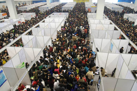 1月18日,無錫市畢業(yè)生雙選會(huì)現(xiàn)場(chǎng)人頭攢動(dòng)。當(dāng)日,2009年無錫市畢業(yè)生雙選交流會(huì)暨大型人才交流會(huì)在無錫市體育中心舉行,300多家用人單位進(jìn)場(chǎng)招聘,為求職者提供了3000多個(gè)崗位,吸引了約1.8萬名學(xué)子前來求職。