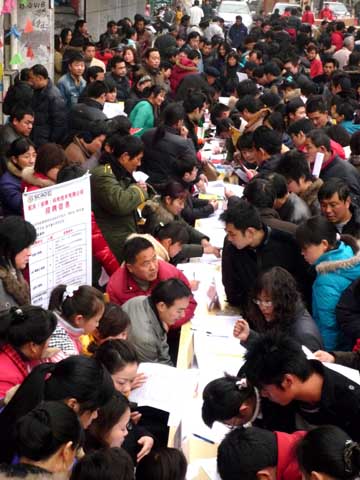 當(dāng)日,安徽省蚌埠市懷遠(yuǎn)縣政府在縣勞動(dòng)力市場(chǎng)舉辦2009年首場(chǎng)大型春季企業(yè)用工暨返鄉(xiāng)農(nóng)民工現(xiàn)場(chǎng)招聘會(huì),該縣的120余家企業(yè)為返鄉(xiāng)農(nóng)民工提供就業(yè)崗位3000多個(gè)。新華社發(fā)(葉勝利攝)