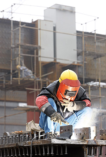 2月9日,一名工人在京滬高鐵上海虹橋站工地焊接地下鋼梁。春節(jié)假日期間,千里京滬高速鐵路建設(shè)工地,依然是一派熱火朝天的施工景象。京滬高速鐵路全線開工以來,取得的成績超過預(yù)期,開局之年各項(xiàng)建設(shè)任務(wù)目標(biāo)均如期順利完成。