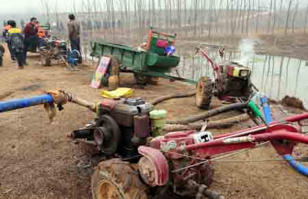 小農(nóng)機(jī)發(fā)揮大作用。2月6日,在河南省洛陽市伊川縣鳴皋鎮(zhèn)武莊村,村民把手扶拖拉機(jī)集中在一起準(zhǔn)備抽水澆灌麥田。新華社記者:王頌
