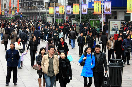 2月15日,上海市南京路上人流如織。日前公布的《2008年上海市國(guó)民經(jīng)濟(jì)和社會(huì)發(fā)展統(tǒng)計(jì)公報(bào)》顯示,至2008年末,上海全市常住人口總數(shù)達(dá)1888.46萬(wàn)人。