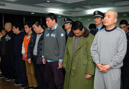 2月15日,被告人在法庭上。當(dāng)日,上海市普陀區(qū)人民法院對(duì)涉案金額高達(dá)60余億元的“上海網(wǎng)絡(luò)賭球第一案”的20名被告人進(jìn)行一審宣判:以開設(shè)賭場(chǎng)罪判處主犯錢葆春有期徒刑6年,并處罰金500萬元;判處被告人溫翔霖有期徒刑5年,并處罰金101萬元;判處被告人鄒軍、劉必清、林興等18人有期徒刑2年8個(gè)月至1年不等,并處2萬-100萬元不等的罰金,其中朱春燕等5人因犯罪情節(jié)輕被判處緩刑。