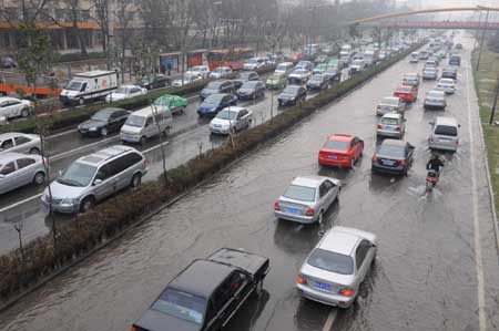 2月18日晨,由于自來水主管道輸水聯(lián)絡(luò)線爆裂,陜西省西安市南二環(huán)長安大學(xué)路段汪洋一片,造成交通擁堵。自來水公司管網(wǎng)搶修人員快速趕到現(xiàn)場進(jìn)行搶修,該路段交通于上午9時(shí)左右恢復(fù)正常。圖為車輛在西安市南二環(huán)長安大學(xué)附近路段涉水前行。