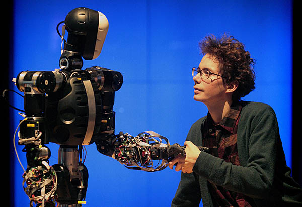 2月17日,在英國倫敦的科學(xué)博物館,一名工作人員與一個名為BERTI的機器人握手。設(shè)計這個機器人的初衷是幫助科學(xué)家研究未來人與機器人如何互相影響。新華社/法新