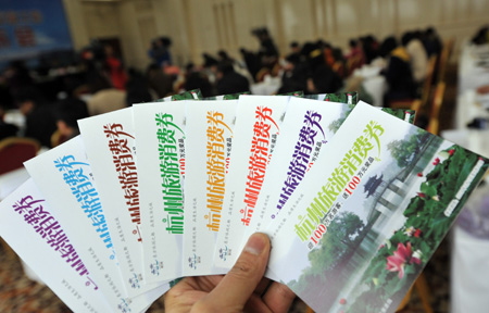 2月26日,在“杭州旅游消費券”新聞發(fā)布會上,工作人員正在展示杭州旅游消費券 。 當天,杭州舉行新聞發(fā)布會,介紹剛剛推出的“杭州旅游消費券”,本次杭州及下屬7縣市發(fā)放的旅游消費券共240萬套,總額為1.5億元,可以在指定商家使用,預(yù)計將在當?shù)乩瓌?0億元的旅游消費。杭州旅游消費券將通過媒體、網(wǎng)站、銀行、旅行社、行業(yè)協(xié)會等渠道向內(nèi)地及港澳臺地區(qū)的旅游者發(fā)放,發(fā)放的截止時間為3月15日。