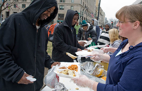 3月7日,在美國華盛頓,志愿者向無家可歸者分發(fā)食物。美國勞工部6日公布的數(shù)據(jù)顯示,今年2月份美國非農(nóng)業(yè)部門就業(yè)崗位減少65.1萬個,失業(yè)率上升至8.1%,為1983年年底以來的最高水平。新華社/法新