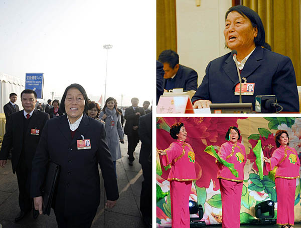 攝 (右下圖)3月7日,全國人大代表申紀(jì)蘭(中)在三八國際勞動(dòng)?jì)D女節(jié)慶祝活動(dòng)中表演。 新華社記者 楊宗友