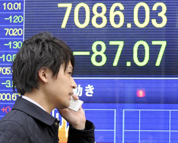 3月9日,在日本首都東京,一名路人經(jīng)過電子股價(jià)顯示牌。當(dāng)日,東京股市日經(jīng)225種股票平均價(jià)格指數(shù)下跌1.21%,跌至26年多來的最低水平。新華社/法新