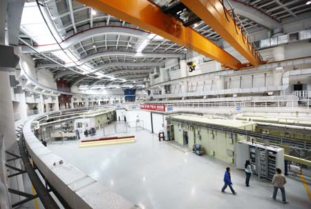 圖為3月16日拍攝的“上海光源”高性能電子儲(chǔ)存環(huán)旁的部分實(shí)驗(yàn)站。 據(jù)悉,世界矚目的我國(guó)重大科學(xué)工程“上海光源”建設(shè)進(jìn)展順利,將按工程計(jì)劃于今年四月底建成并投入使用?偼顿Y約12億元的“上海光源”工程坐落于上海浦東張江高科技園區(qū)內(nèi),占地面積約20萬(wàn)平方米。同步輻射光源被科學(xué)家稱之為繼電光源、X光源和激光光源之后,第四次為人類文明帶來(lái)革命性推動(dòng)的新光源。 |