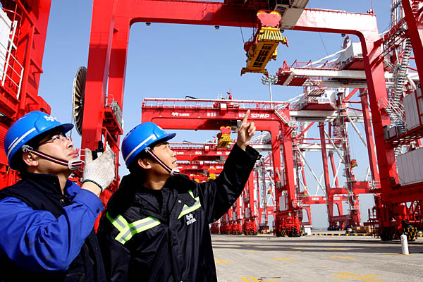 3月16日,兩名工作人員在天津港新建集裝箱碼頭上查看設(shè)備安裝情況。