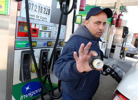 3月17日,在美國紐約的一個加油站,工人在為顧客加油。當(dāng)日,受到積極經(jīng)濟(jì)數(shù)據(jù)以及紐約股市強(qiáng)勁上漲的刺激,國際油價大幅上揚近4%,收在每桶49美元之上,創(chuàng)下去年12月以來最高收盤價。