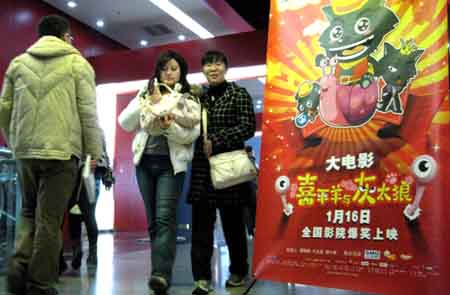 國產(chǎn)動(dòng)畫片逆風(fēng)飛揚(yáng),“喜羊羊”票房突破八千萬。在北京首都電影院,觀眾走過《喜羊羊與灰太狼之牛氣沖天》電影海報(bào)展板。