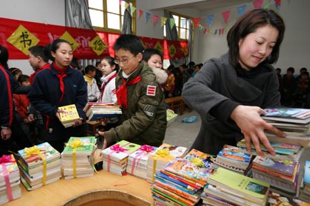 援建農(nóng)民工子弟學(xué)校圖書室。3月5日,浙江省舟山市南海實(shí)驗(yàn)學(xué)校的同學(xué)將圖書送到定海區(qū)長峙陽光學(xué)校。