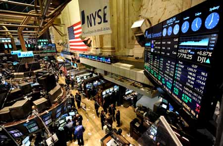 3月23日,交易員在美國紐約證券交易所內(nèi)忙碌。當(dāng)日,由于美國政府公布了幫助銀行業(yè)剝離不良資產(chǎn)的詳細內(nèi)容,極大地鼓舞了投資者,紐約股市三大股指漲幅均超過6.5%,道瓊斯指數(shù)上漲近500點,標(biāo)普重新站上800點關(guān)口。