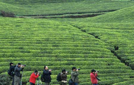 3月28日,攝影愛好者在湄潭縣拍攝“茶!憋L光。貴州省湄潭縣是黔北地區(qū)最大的茶葉生產基地,有茶園約20萬畝,被譽為“西部茶鄉(xiāng)”,當?shù)氐牟鑸@連片發(fā)展,形成了蔚為壯觀的“茶!,成為鄉(xiāng)村生態(tài)旅游的“名片”。