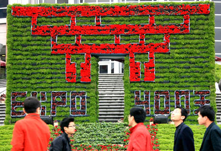 3月31日,一些游客從鮮花墻前走過。當(dāng)日,即將揭幕的上海春季花展外景“世博鮮花墻”在上海中心城區(qū)徐家匯亮相。鮮花墻由中國主題館造型和倒計時400天字樣組成,表達(dá)了上海人民的“世博情”,提醒人們2010年上海世博會的腳步越來越近。