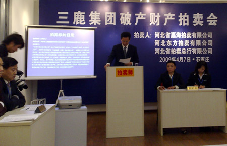 這是三鹿第二批破產(chǎn)財(cái)產(chǎn)拍賣(mài)會(huì)現(xiàn)場(chǎng)(4月7日攝)。當(dāng)日,石家莊三鹿集團(tuán)股份有限公司第二批破產(chǎn)財(cái)產(chǎn)在河北省嘉海拍賣(mài)有限公司進(jìn)行了拍賣(mài),河北貝蘭德乳業(yè)有限公司和石家莊君樂(lè)寶乳業(yè)有限公司成功回購(gòu)了原屬三鹿的股權(quán)。