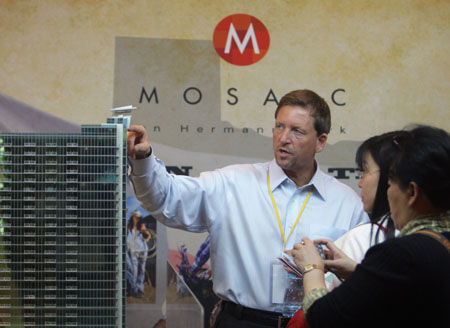 4月12日,來自美國馬賽克公司的經(jīng)銷總經(jīng)理托馬斯(左)在向中國消費(fèi)者介紹他們的房子。4月10日至12日,美中房地產(chǎn)展示交易會在北京召開,該交易會由美中貿(mào)易發(fā)展協(xié)會等單位組織,70多家美國開發(fā)商和中介機(jī)構(gòu)參加交易會。據(jù)主辦方預(yù)計(jì)在3天時間內(nèi),會有500多套住宅意向成交。