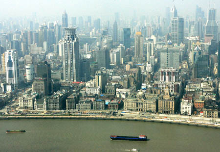 上海黃浦江邊的外灘金融街鳥(niǎo)瞰(3月25日攝)。 上海市商務(wù)委員會(huì)4月11日發(fā)布的信息顯示,雖然遭遇金融危機(jī),但2009年一季度上海外向型經(jīng)濟(jì)發(fā)展好于預(yù)期,實(shí)到外資23.2億美元,比2008年同期增長(zhǎng)2.3%,總體情況略好于周邊地區(qū)及全國(guó)平均水平。