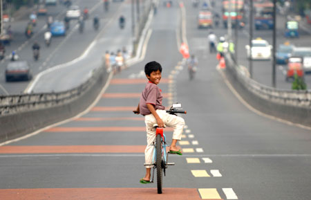 12日,在印度尼西亞首都雅加達的蘇拉多將軍(Letjen Suprapto)大街上,一名男孩在寬闊的道路上騎自行車。 當天,雅加達政府新增加的蘇拉多將軍(Letjen Suprapto)大街舉行無車日活動,除公交車以外的所有機動車輛從早上6點到下午2點禁止進入無車道路,市民可以在規(guī)定的道路上進行體育活動,以提高環(huán)境保護意識,減少車輛對城市的空氣污染。