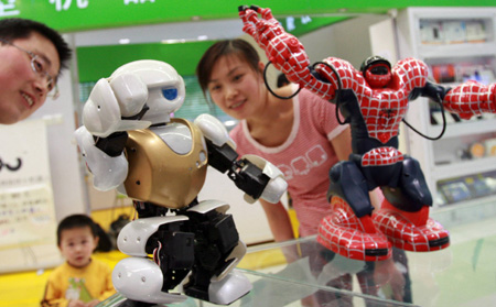 4月19日,顧客在北京中關(guān)村的機(jī)器人專營店內(nèi)觀賞機(jī)器人。近日,一家機(jī)器人專營店在北京中關(guān)村鼎好電子商城開業(yè)。該店匯集了國內(nèi)外娛樂、保潔、家用及教學(xué)四大類的實用型機(jī)器人近百個品種,吸引了眾多顧客駐足觀看。