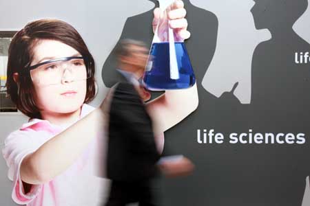 20日,一名參觀者在德國(guó)漢諾威工業(yè)展上經(jīng)過(guò)一幅“生命科學(xué)”的宣傳海報(bào)。全球最大的工業(yè)博覽會(huì)漢諾威工業(yè)展當(dāng)日向公眾開放,來(lái)自61個(gè)國(guó)家和地區(qū)的6150家參展商將展示自己的最新產(chǎn)品和研發(fā)理念。