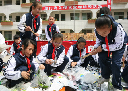 蘋果手機、LV皮包、GUCCI手表、福娃鑰匙扣……這些鼎鼎大名的“世界名牌”通通在廈門市海滄區(qū)東瑤小學(xué)一群小朋友的錘子和剪刀下,被一一銷毀。不過,這些所謂的“世界名牌”都是被海關(guān)查扣的侵權(quán)產(chǎn)品。此次活動共現(xiàn)場銷毀仿冒知名品牌的手機、皮包、汽車配件、機電產(chǎn)品、香煙等各類侵權(quán)產(chǎn)品474533件。