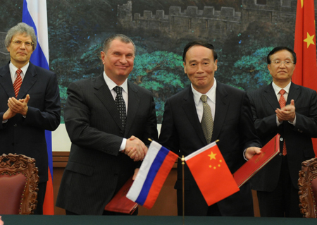 4月21日,國務(wù)院副總理王岐山在北京人民大會(huì)堂同俄羅斯副總理謝欽舉行中俄能源談判代表第四次會(huì)晤,共同簽署了《中俄石油領(lǐng)域合作政府間協(xié)議》,雙方管道建設(shè)、原油貿(mào)易、貸款等一攬子合作協(xié)議隨即生效。
