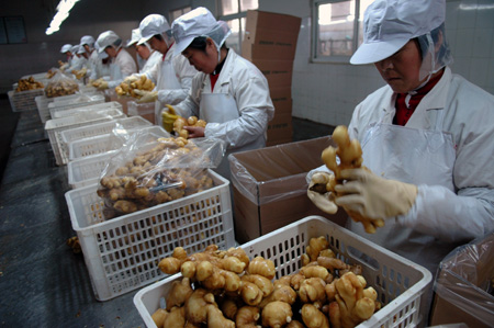 4月22日,在山東省日照市的一個(gè)生姜加工車間內(nèi),工人們?cè)诩庸ど?BR> 日照生姜曾因不符合要求于2006年終止出口日本。近幾年,當(dāng)?shù)赝ㄟ^實(shí)施基地建設(shè)、農(nóng)資統(tǒng)一配送、科學(xué)儲(chǔ)存等措施,生姜達(dá)到出口要求,近日恢復(fù)了對(duì)日本出口。