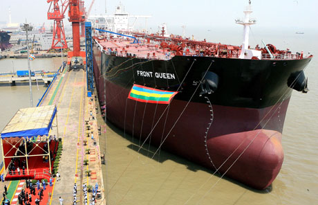 5月18日,萬噸超級油輪靠泊在上海外高橋碼頭。當日,由上海外高橋造船公司為挪威建造的29.7萬噸超級油輪“皇后”號命名交船。至此,該公司已累計完工交付100艘船,近1650萬載重噸。 受國際金融危機影響,全球造船業(yè)接單難、交船難已成為世界性的課題。外高橋造船公司自我加壓,降本增效,造船生產(chǎn)呈現(xiàn)出一派繁忙景象。