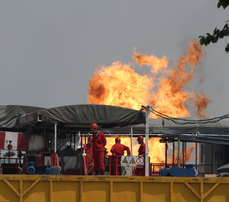 5月20日,四川德陽旌陽區(qū)德新鎮(zhèn)新場氣田事故氣井正在燃燒。5月19日19時(shí)許,四川德陽旌陽區(qū)德新鎮(zhèn)新場氣田一正在建設(shè)中的氣井發(fā)生井噴事故,當(dāng)?shù)卣杆偈枭⒘酥車幼〉娜罕姟?0日凌晨5時(shí)05分,在消防官兵和新場氣田搶險(xiǎn)人員的配合下,事故氣井被成功封住,5時(shí)15分成功點(diǎn)火。目前,燃燒仍在持續(xù),當(dāng)?shù)鼐旌拖拦俦诂F(xiàn)場進(jìn)行保衛(wèi),被疏散的群眾已經(jīng)回家。事故未造成人員傷亡。 |