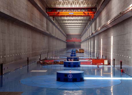 這是三峽電站左岸電廠內(nèi)景(5月21日攝)。 據(jù)介紹,至5月中旬,三峽電站連續(xù)安全穩(wěn)定運(yùn)行已超過1000天,標(biāo)志著我國大型水電站機(jī)組制造和運(yùn)行管理水平躍上新臺階。三峽電站初步設(shè)計共安裝26臺單機(jī)容量為70萬千瓦的巨型發(fā)電機(jī)組,其中有8臺為國產(chǎn)化機(jī)組。目前,26臺機(jī)組已全部投產(chǎn)發(fā)電,使三峽電站的巨大效益得到充分發(fā)揮。