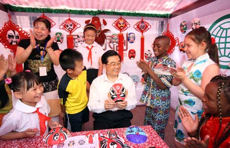 在“六一”國(guó)際兒童節(jié)到來(lái)之際,5月31日,中共中央總書記、國(guó)家主席、中央軍委主席胡錦濤來(lái)到北京市朝陽(yáng)區(qū)芳草地國(guó)際學(xué)校,親切看望中外小朋友們。這是胡錦濤同中外小學(xué)生一起畫京劇臉譜。