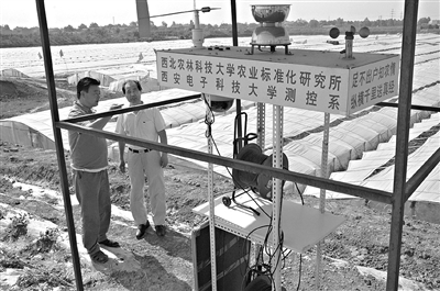 6月5日李鑫教授在室內(nèi)通過電腦指導瓜農(nóng)生產(chǎn)。陜西楊凌區(qū)大寨鄉(xiāng)官村天和園果蔬專業(yè)合作社的瓜農(nóng)們通過一種“電腦遠程遙控”系統(tǒng)種植出來的西瓜,不僅瓤脆、甜度大、水分多,而且價格也高出市場的2到3倍。這種由西北農(nóng)業(yè)科技大學李鑫教授和西安電子科技大學共同完成的“電腦遠程遙控”系統(tǒng),不但可以“遙控”生產(chǎn),還參與銷售,食品安全透明度大大增強。