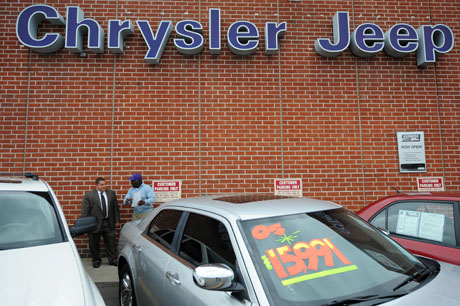 9日,在美國(guó)加利福尼亞州格倫代爾的一家克萊斯勒經(jīng)銷(xiāo)處,一名顧客(右)和銷(xiāo)售人員交談。美國(guó)最高法院當(dāng)日做出裁決,允許意大利汽車(chē)廠商菲亞特收購(gòu)美國(guó)汽車(chē)巨頭克萊斯勒股份。此前最高法院曾因退休基金持有者上訴而叫停汽車(chē)業(yè)巨頭克萊斯勒破產(chǎn)重組的并購(gòu)程序。意大利菲亞特汽車(chē)公司10日已就收購(gòu)美國(guó)克萊斯勒汽車(chē)公司資產(chǎn)正式達(dá)成交易。