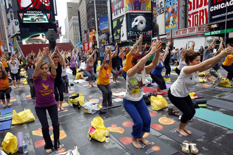 21日,上千名瑜伽愛好者聚集在紐約時報廣場,用集體瑜伽的方式迎接夏至的到來。