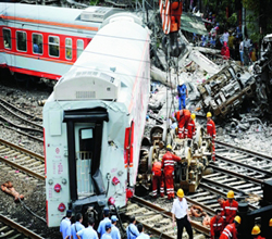 6月29日,救援人員正在現(xiàn)場奮力搶修。當(dāng)日凌晨,由長沙開往深圳的K9017次和銅仁開往深圳西的K9063次列車在湘粵邊界湖南郴州火車站內(nèi)發(fā)生側(cè)面沖撞事故,事故造成3人死亡,60余人受傷。事故發(fā)生后,救援部門緊急調(diào)來了應(yīng)急發(fā)電、照明設(shè)備和切割機(jī)、大型千斤頂?shù)染仍O(shè)備,奮力搶修清理。經(jīng)過奮力搶修清理,7時06分,京廣線上行(北上)已恢復(fù)運(yùn)行,14時25分,京廣線下行(南下)恢復(fù)運(yùn)行。至此,京廣全線基本恢復(fù)正常行車。 |