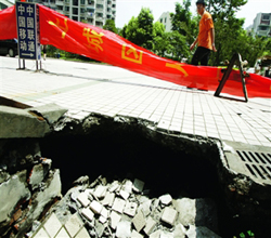 住宅樓前的塌陷現(xiàn)場(7月1日攝)。 7月1日清晨,杭州市飛云江路鳳凰南苑高層住宅區(qū)里的很多居民先后發(fā)現(xiàn)24層住宅樓前發(fā)生約十平方米坍塌,留下深約一米的大坑。開發(fā)單位杭州市房地產(chǎn)聯(lián)合開發(fā)總公司工程部有關(guān)負責(zé)人2日在接受記者采訪時表示,他們正在和專業(yè)鑒定機構(gòu)簽署協(xié)議,委托鑒定,給小區(qū)居民一個權(quán)威說法。新華社發(fā)