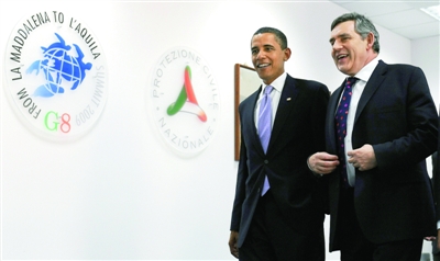 7月8日,在意大利中部城市拉奎拉,美國總統(tǒng)奧巴馬(左)與英國首相布朗一起抵達(dá)八國峰會主會場。當(dāng)日,八國集團(tuán)領(lǐng)導(dǎo)人在拉奎拉舉行工作午餐,討論世界經(jīng)濟(jì)問題,這標(biāo)志著為期三天的八國集團(tuán)首腦會議正式拉開帷幕。
